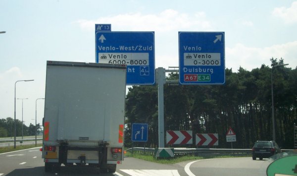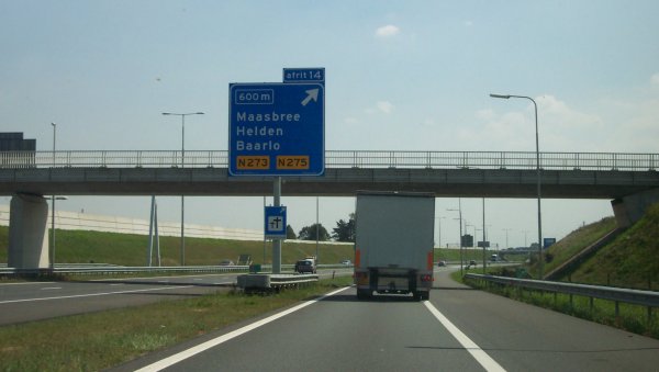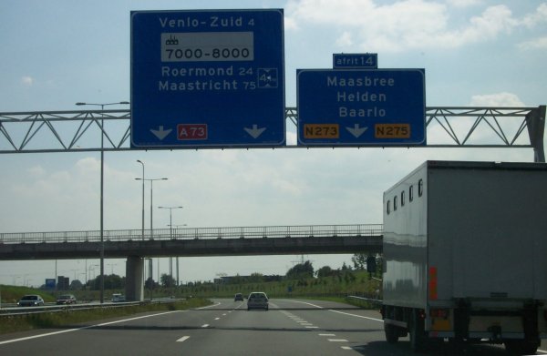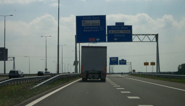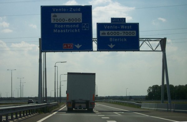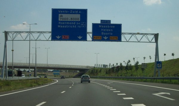 Vorwegweiser der AS Maasbree. Weiter vorn wird auf den Bau der Verlängerung der deutschen A 61 hingewiesen. Sie wurde inzwischen fertiggestellt. In den Niederlanden verläuft diese Autobahn als A 74 weiter.