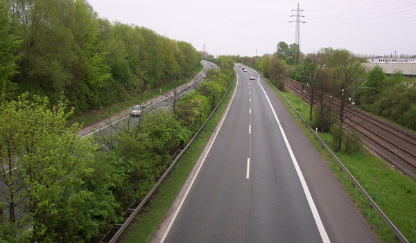 Vor der AS Dortmund-Huckarde/Dortmund-Dorstfeld. Die Bahntrasse neben der Fahrbahn ist ein Betriebsgleis der Stadtbahn der DSW, das die Trasse der U 47 mit dem Betriebshof in Dortmund-Dorstfeld verbindet.