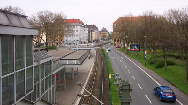 Am östlichen Kopf der Stadtbahnstation Hafen mit Blick auf die Kreuzung Lagerhausstraße/Speestraße. Letztere stellt für die Fahrtrichtung Borsigplatz die Verbindung zum gerade unterquerten Sunderweg her.